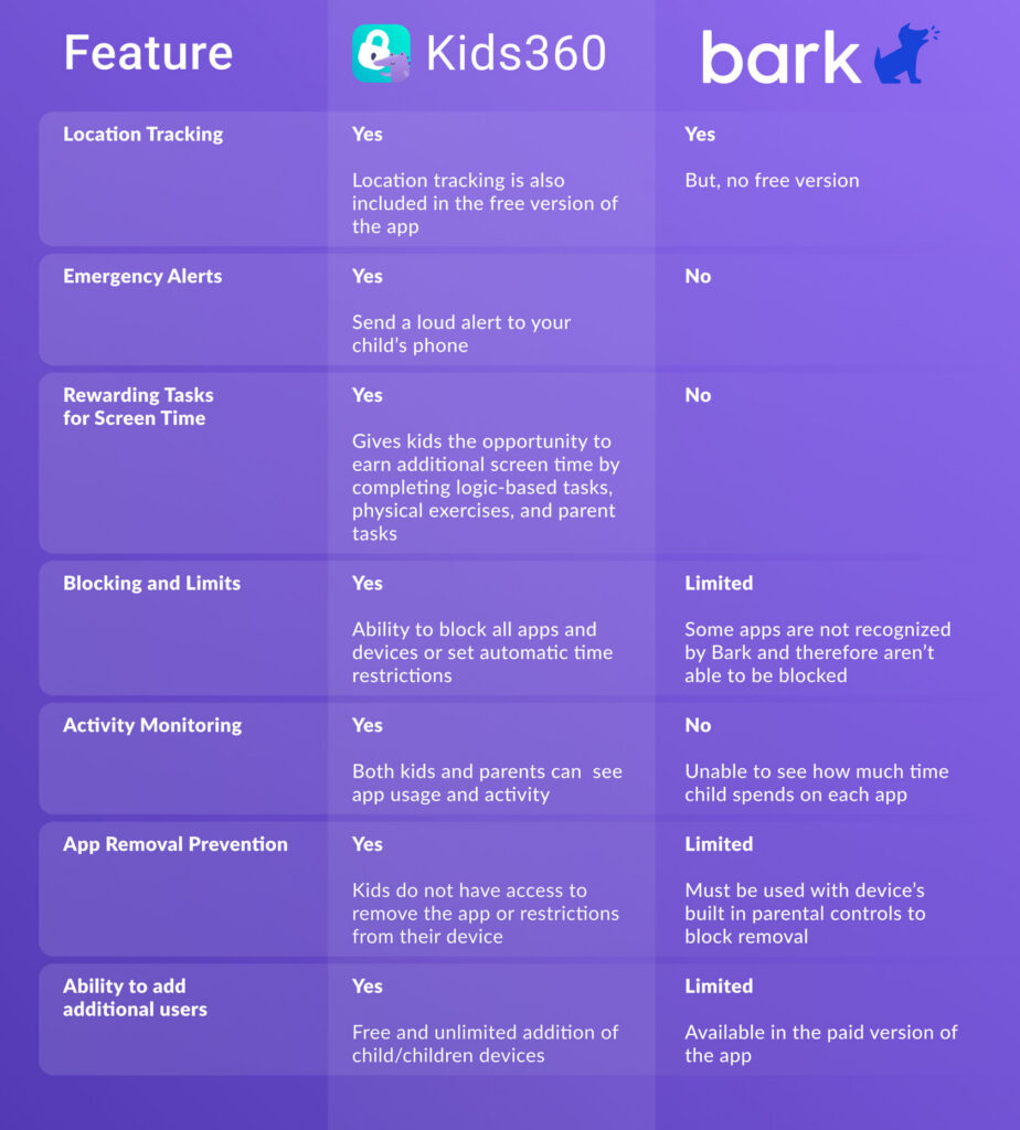 While Bark relies solely on the parent to teach good digital habits through conversation, Kids360 has built in features that encourage kids to take responsibility for their own activity and ownership of their digital boundaries.